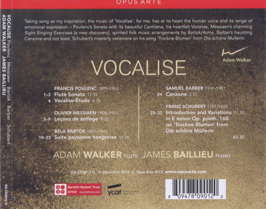 Principal flute of the London Symphony Orchestra, Adam Walker presents a recital of alternately lyric and dynamic music for flute and piano. A lovelorn song from Die schone Mullerin forms the basis of a set of variations by Schubert, and reflective songs without words by Poulenc and Barber offer mellifluous contrast with the dancing energy of Bartok, Messiaen and Poulenc.